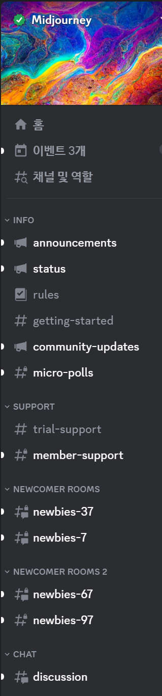 미드저니 봇의 이름이 보이는 곳에서 미드저니 봇을 클릭합니다.