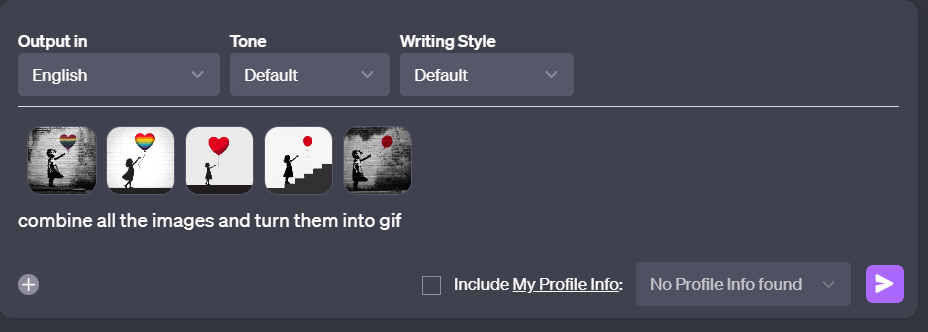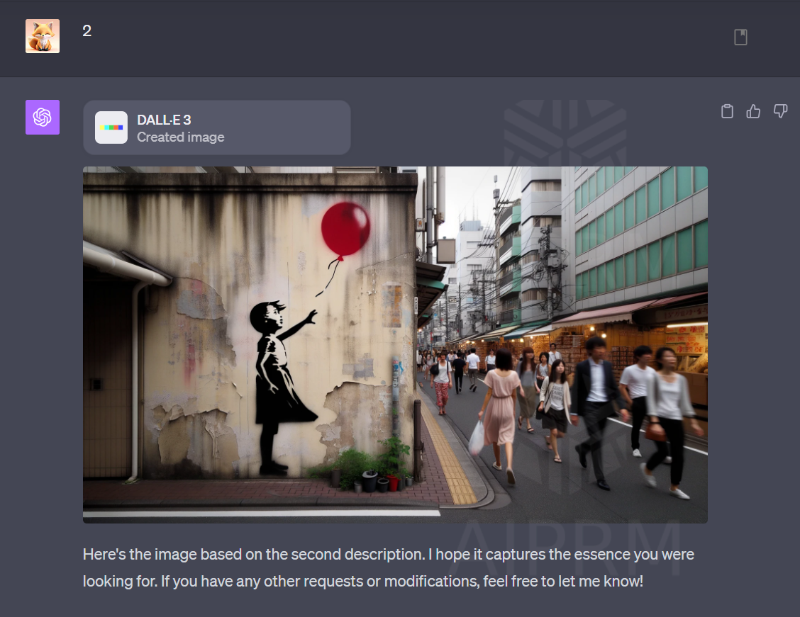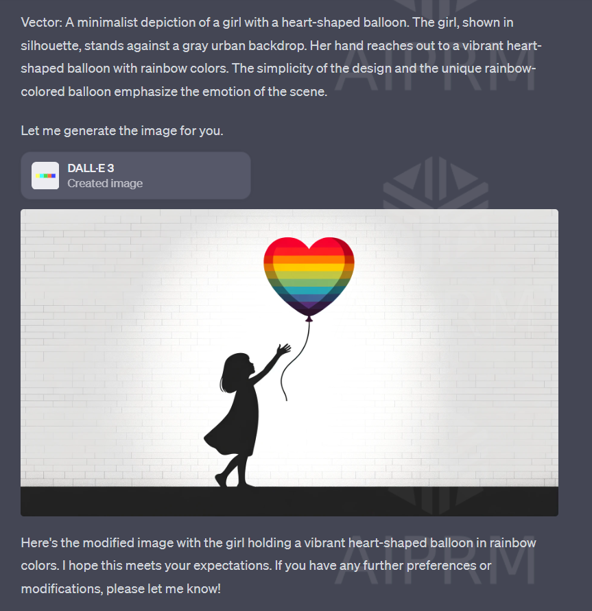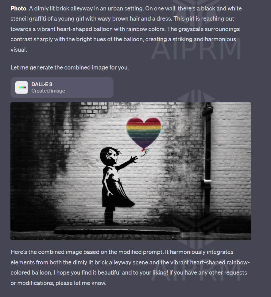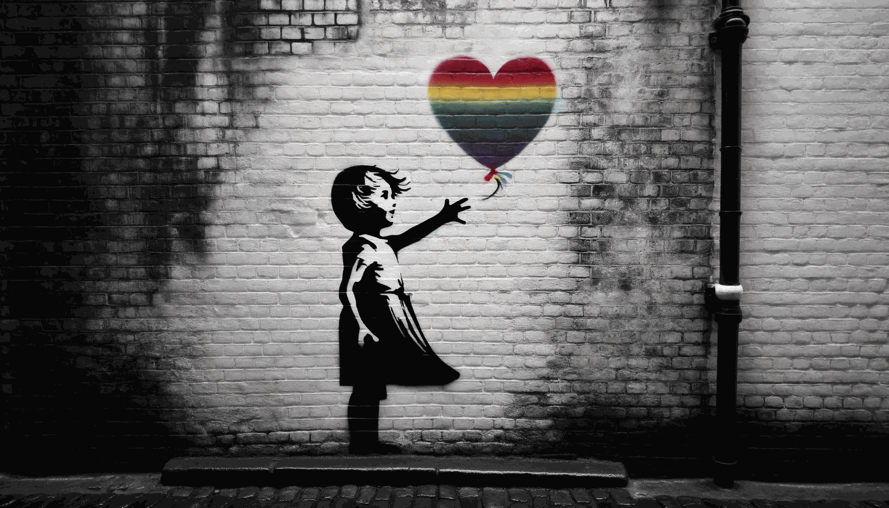 지피티: Certainly! You're asking to harmoniously combine the first image of the dimly lit brick alleyway with the stencil graffiti of a young girl and the last image with the girl holding a rainbow-colored heart-shaped balloon into one beautiful image.