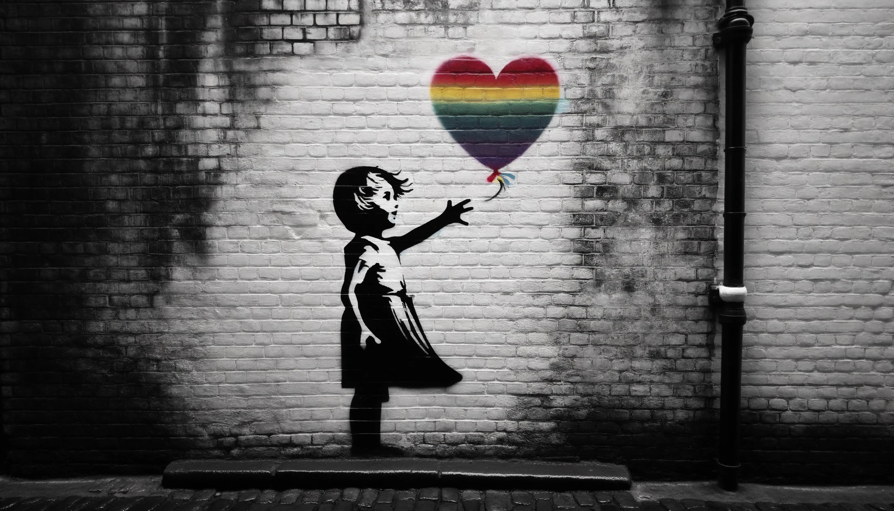 지피티: Photo: A dimly lit brick alleyway in an urban setting. On one wall, there's a black and white stencil graffiti of a young girl with wavy brown hair and a dress. This girl is reaching out towards a vibrant heart-shaped balloon with rainbow colors. The grayscale surroundings contrast sharply with the bright hues of the balloon, creating a striking and harmonious visual.