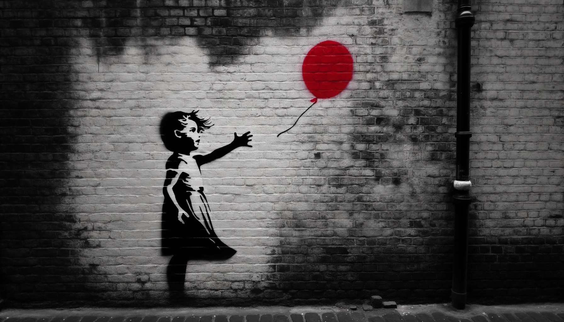 1. 사진: 도시의 어두운 벽돌 골목길. 한쪽 벽에는 물결치는 갈색 머리와 드레스를 입은 어린 소녀가 밝은 빨간색 풍선을 향해 손을 뻗는 흑백 스텐실 그래피티가 그려져 있습니다. 회색조 주변 환경과 빨간 풍선 사이의 대비가 인상적입니다
