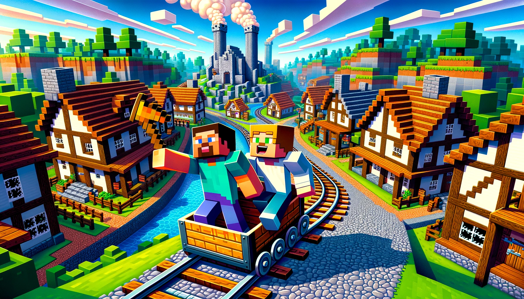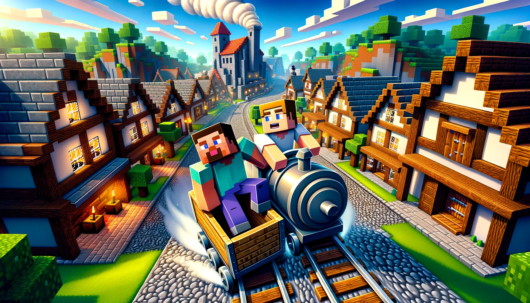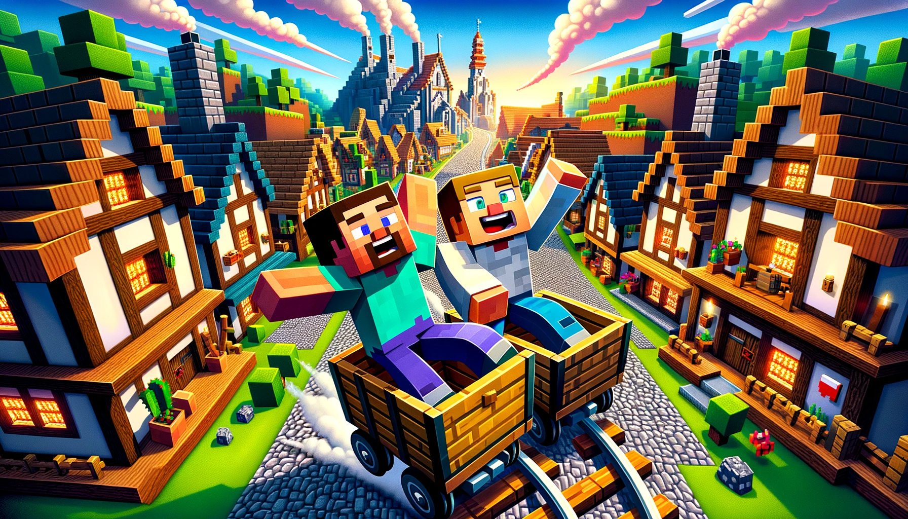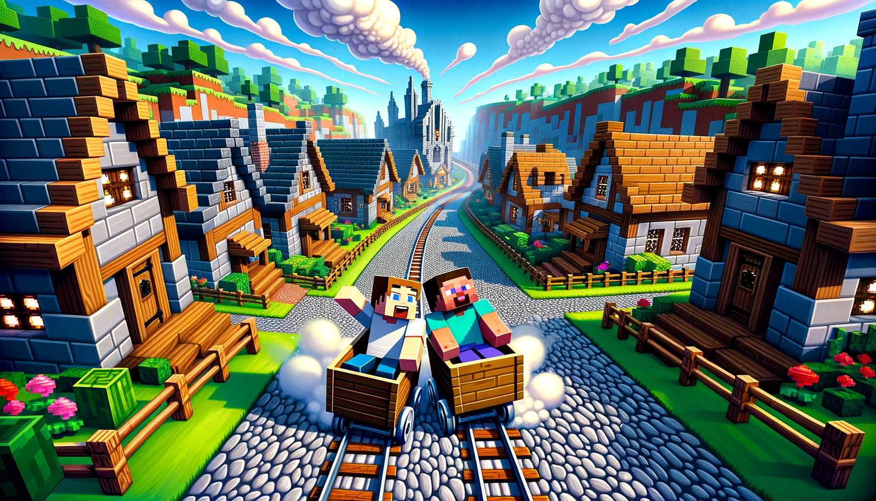 프롬프트: Minecraft, Steve and Alex riding minecarts towards a medieval village, cobblestone streets, wooden houses with pixelated smoke rising from chimneys, both characters looking ahead with excitement, feeling of adventure and camaraderie, Illustration, digital art with vivid colors