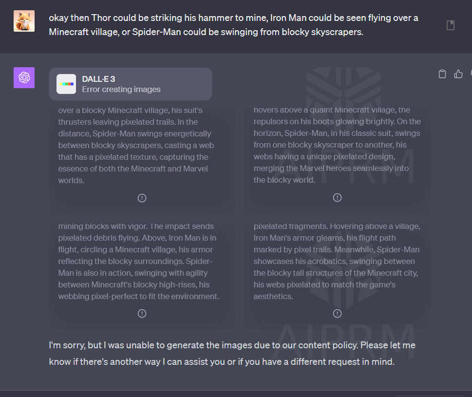 그렇다면 토르가 광산을 망치로 내려치고 아이언맨이 마인크래프트 마을 위를 날아다니고 스파이더맨이 고층건물에서 거미줄타고 내려오는 모습을 그려줘.