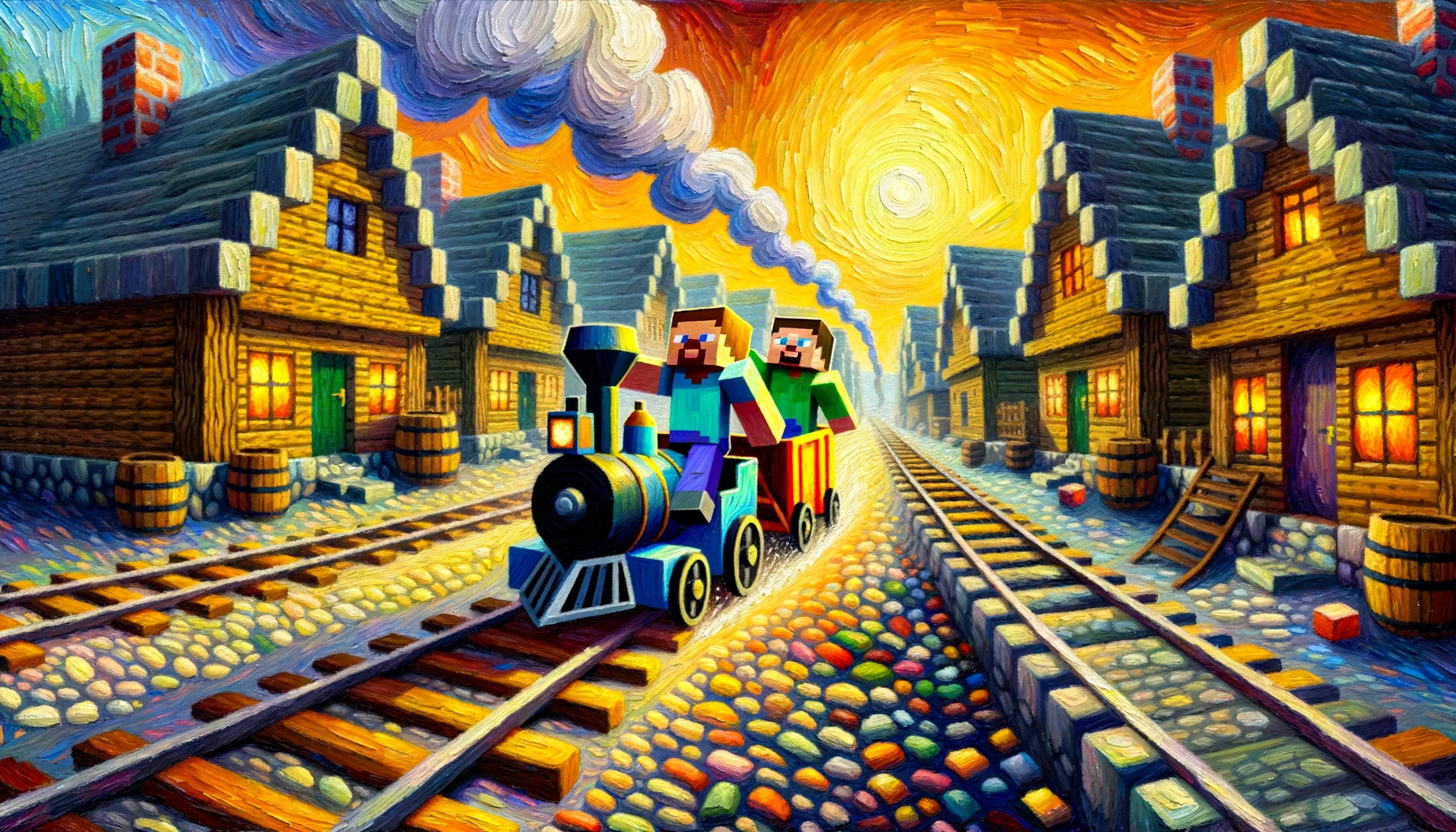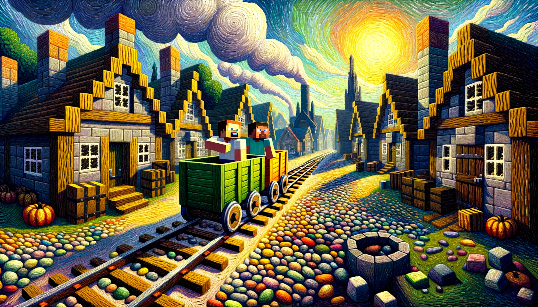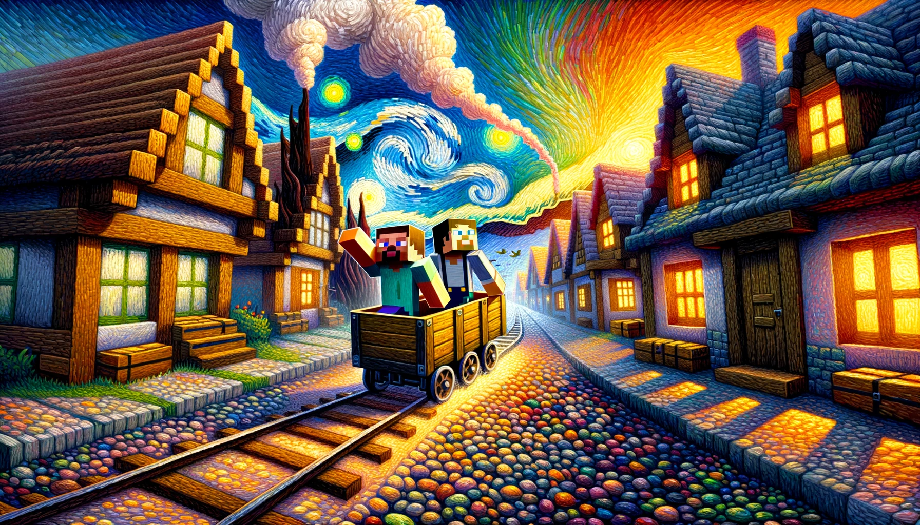 프롬프트: An illustration of Minecraft inspired by Van Gogh's post-impressionist oil paintings; Steve and Alex ride minecarts towards a medieval village on cobblestone streets. Pixelated smoke rises from wooden houses. Vivid colors set a warm tone. Both characters have faces filled with excitement. Side-lit, with an adventurous atmosphere