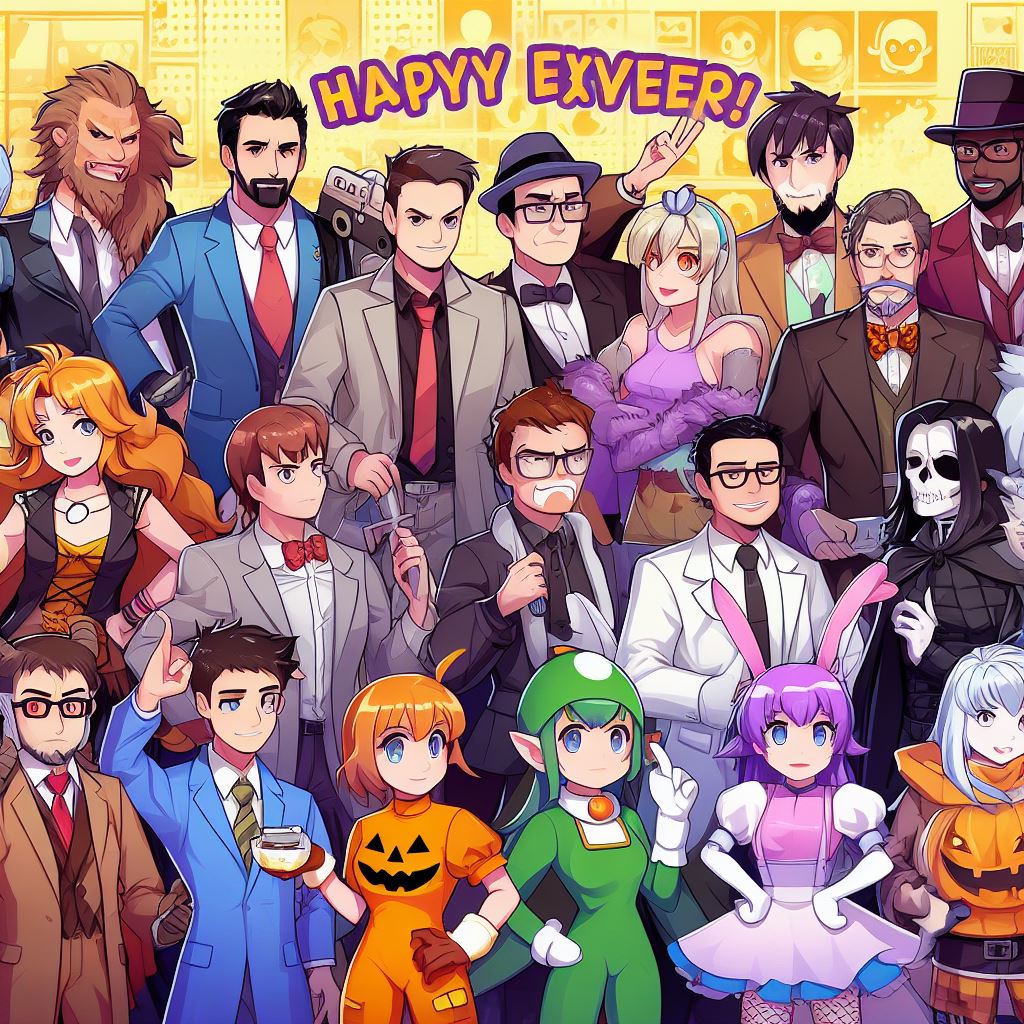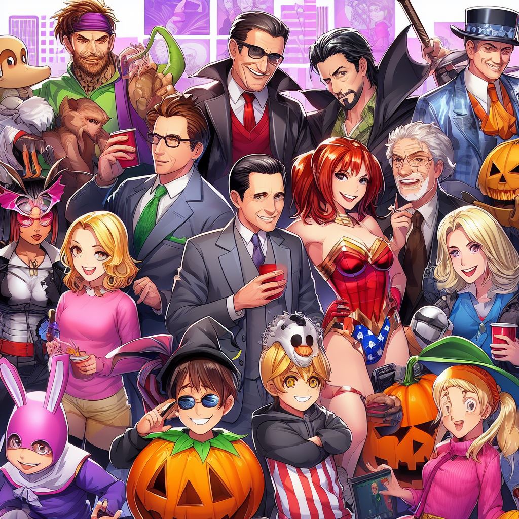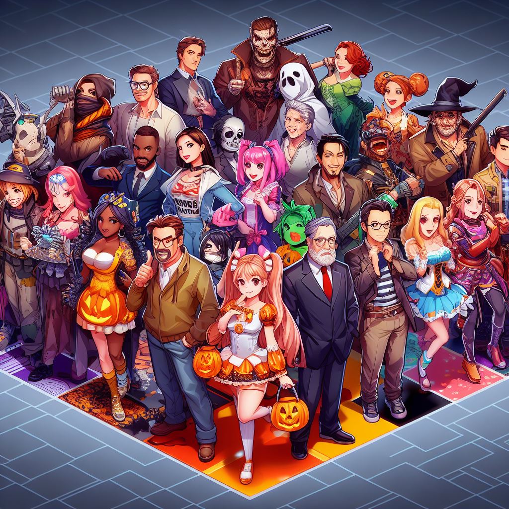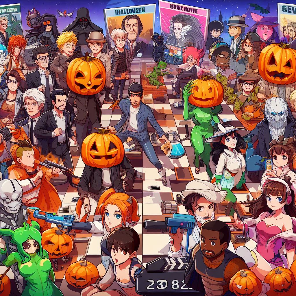 Design an image that brings together TV celebrities, movie characters, and anime characters in a Halloween-themed game background. Picture iconic TV personalities, beloved movie heroes, and popular anime protagonists all interacting in a vibrant and lively scene. Each character should be dressed in a unique Halloween costume, adding a touch of excitement and playfulness to the image. The background can feature references to their respective shows, movies, or anime series