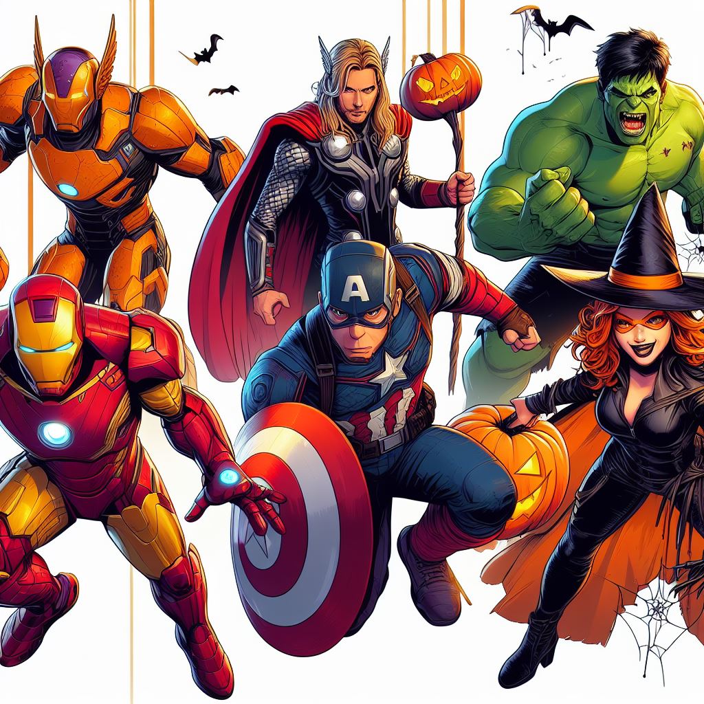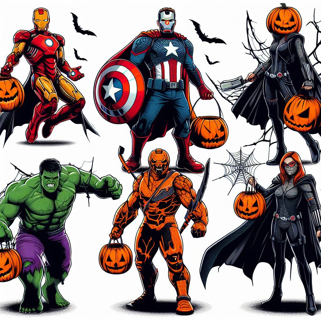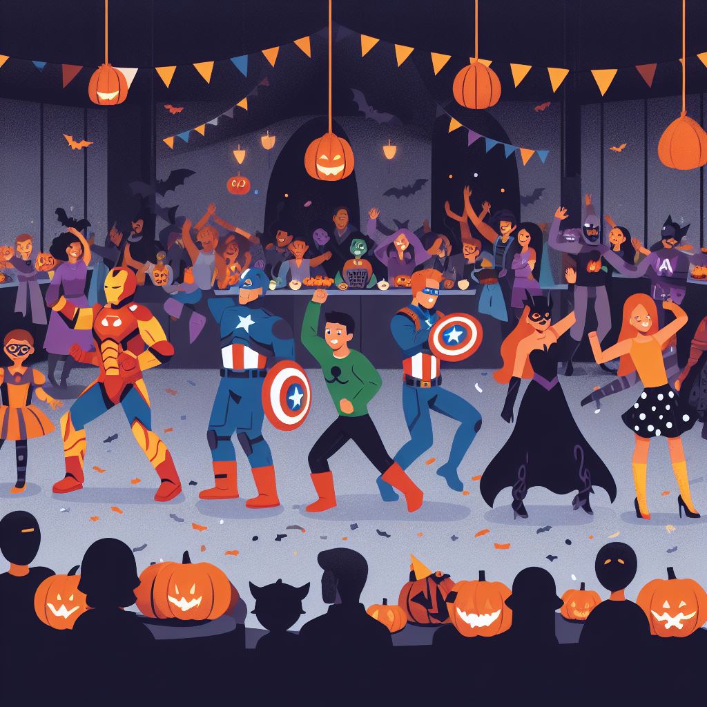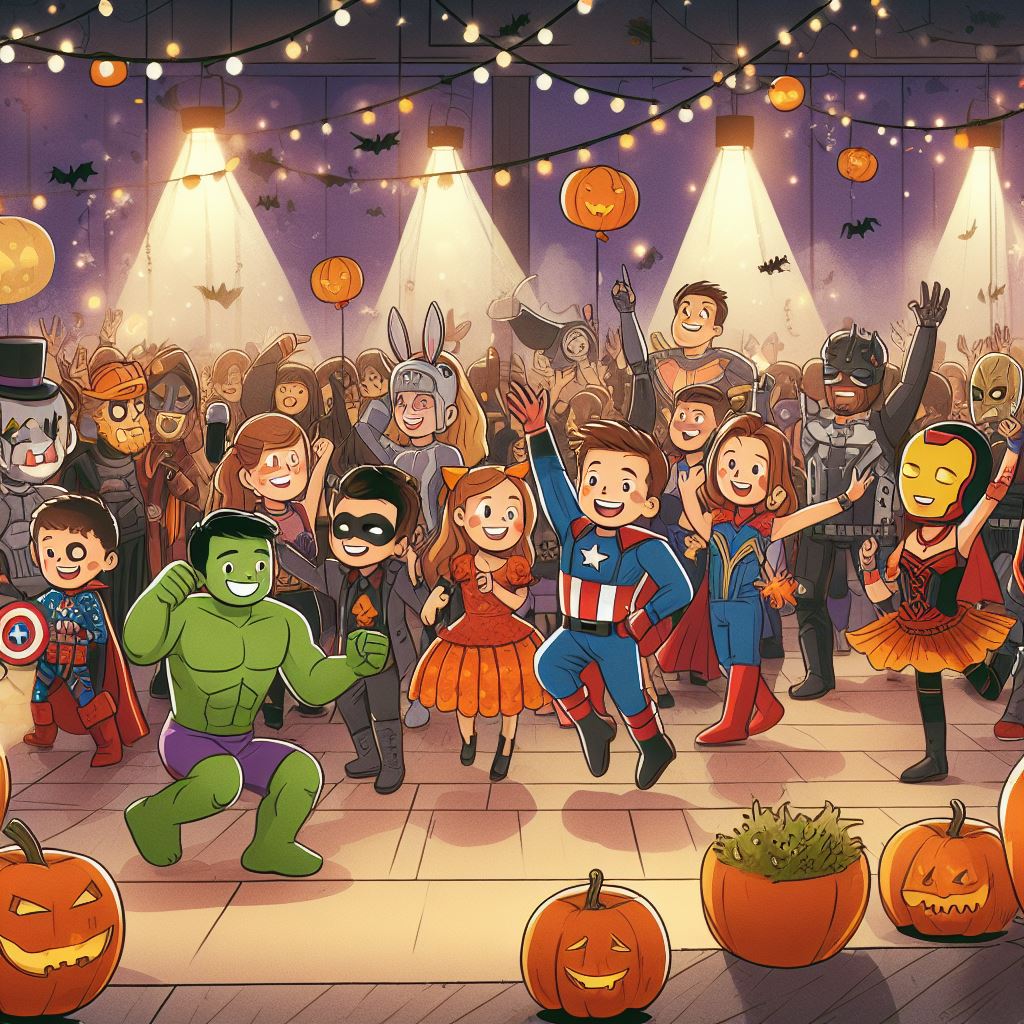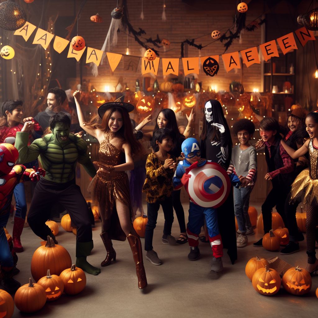 Imagine an image of a Halloween party where the Avengers heroes and kids are having a great time together. Picture a decorated venue with spooky decorations, pumpkins, and costumes. The heroes and kids should be dancing, laughing, and enjoying the festivities. Each hero can showcase their own unique Halloween costume, while the kids can be dressed as their favorite Avengers or other Halloween characters.