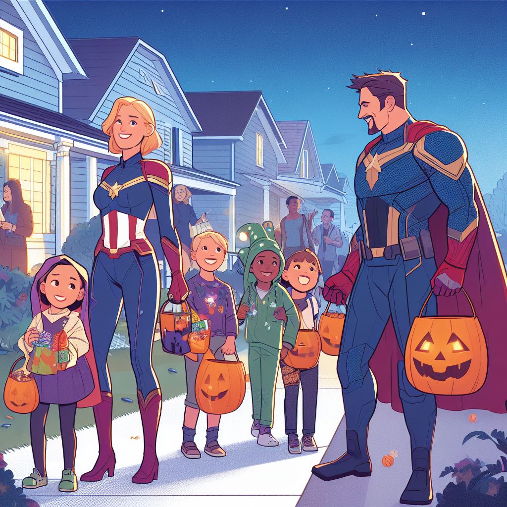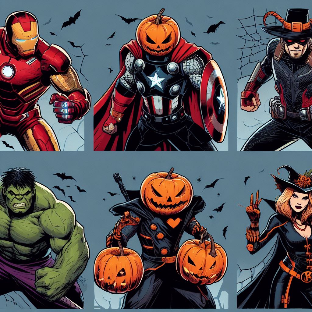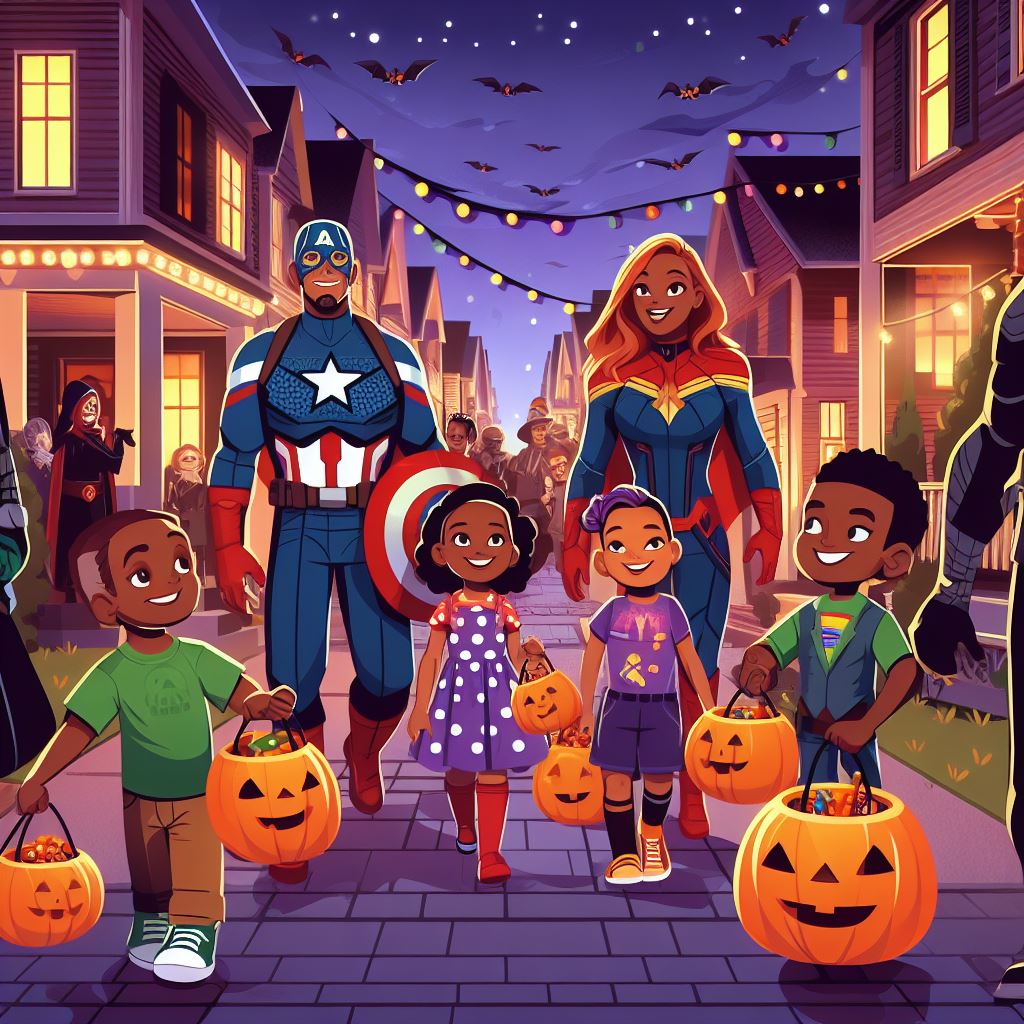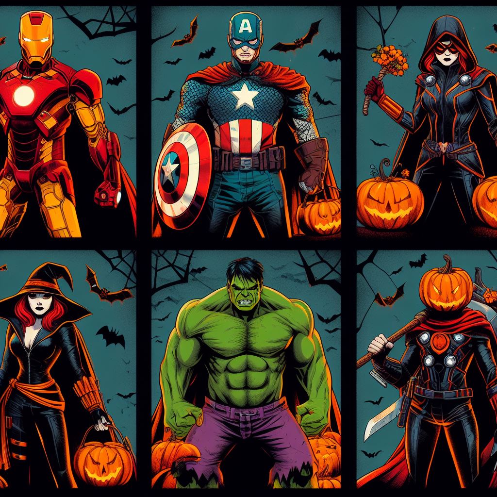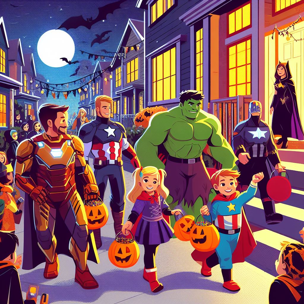Imagine an image of a Halloween party where the Avengers heroes and kids are having a great time together. Picture a decorated venue with spooky decorations, pumpkins, and costumes. The heroes and kids should be dancing, laughing, and enjoying the festivities. Each hero can showcase their own unique Halloween costume, while the kids can be dressed as their favorite Avengers or other Halloween characters.