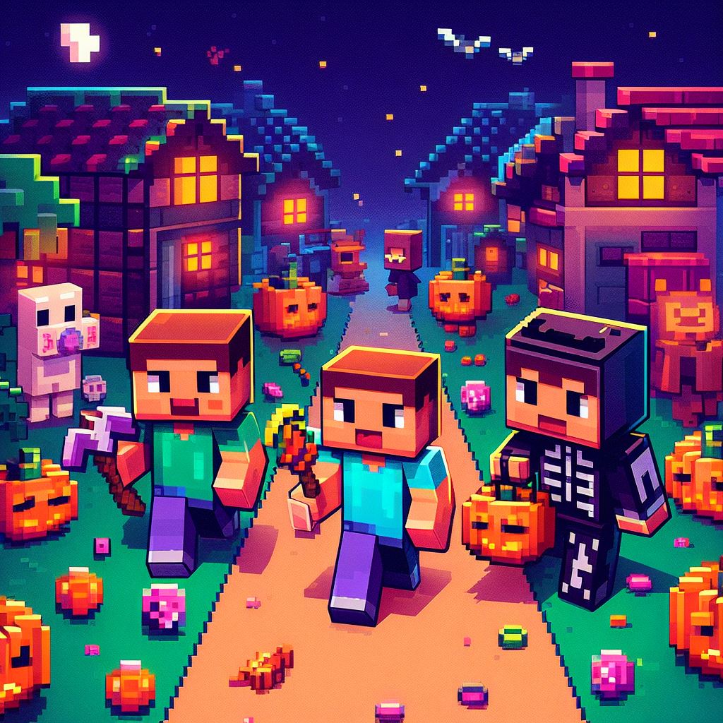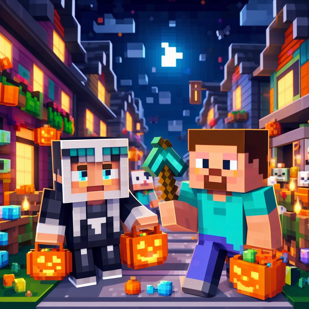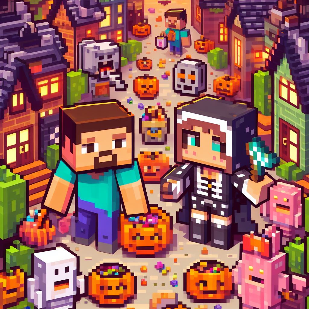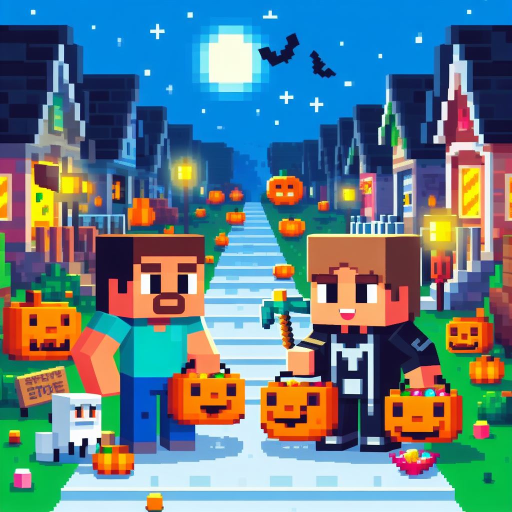 Design an image where Minecraft Pixel Art characters, such as Steve and Alex, go trick-or-treating in a Halloween-themed pixelated world. Imagine them exploring a cute pixelated neighborhood filled with blocky houses, each adorned with Halloween decorations. The characters should be dressed in their own unique Halloween costumes, collecting pixelated candies and enjoying the whimsical atmosphere.