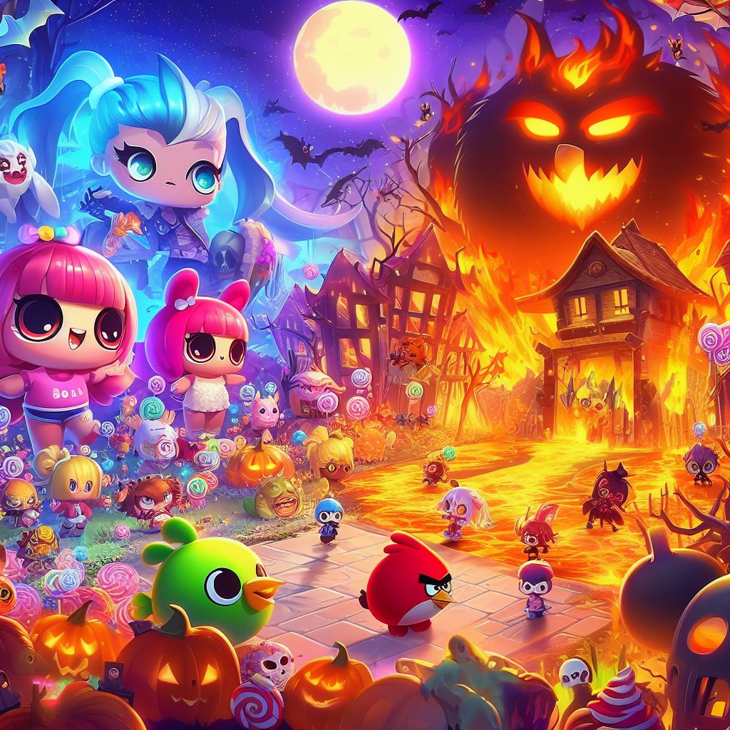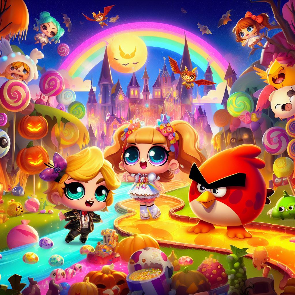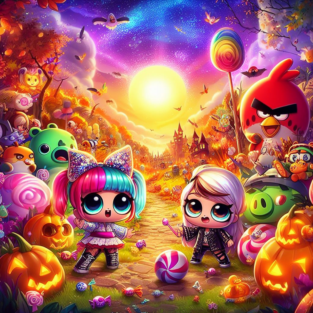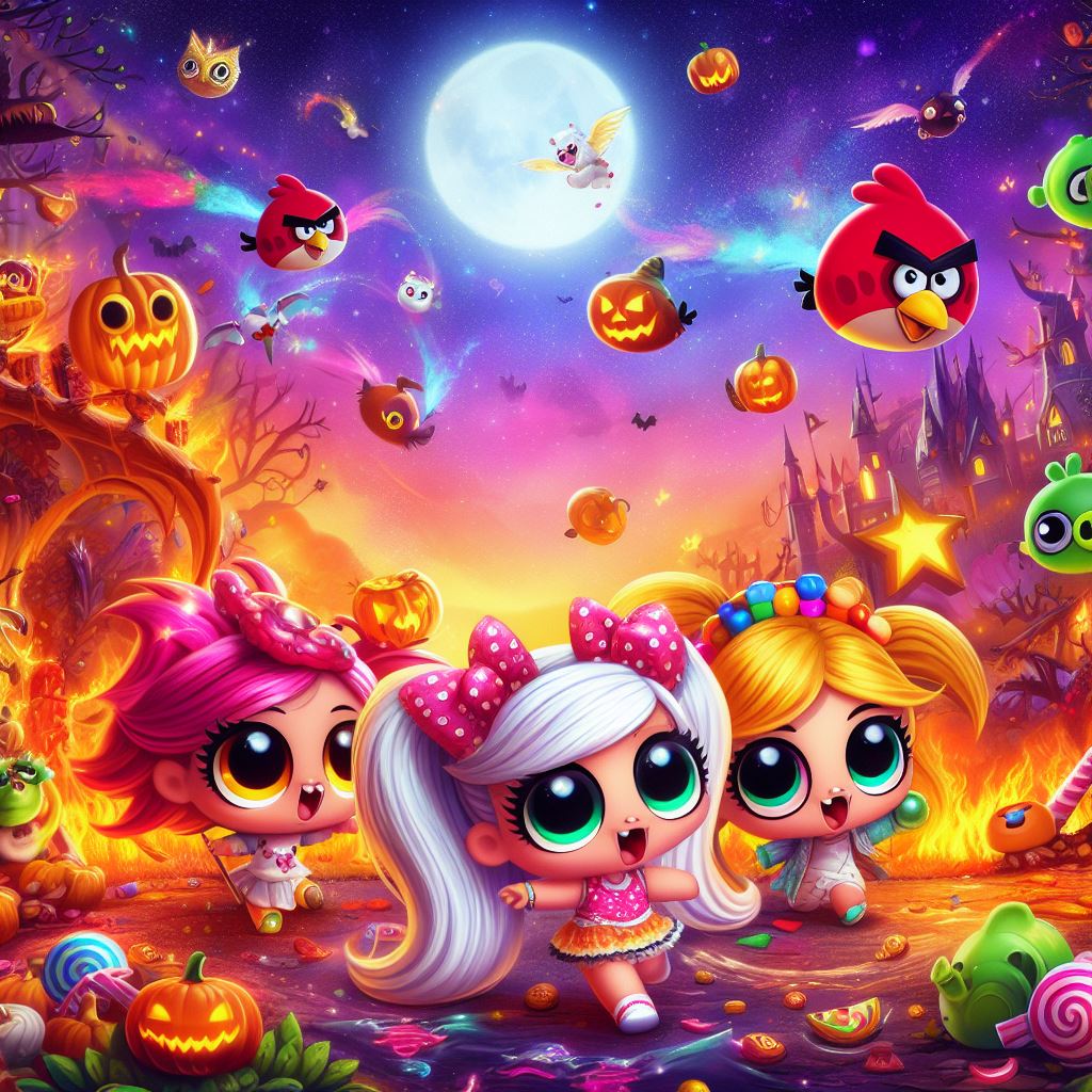 Imagine a game background that combines the whimsical charm of LOL dolls, the fiery energy of Angry Birds, and the captivating allure of anime characters. Create a colorful and dynamic scene where LOL dolls, Angry Birds, and anime characters are engaged in a friendly Halloween-themed adventure. They can be exploring a magical world filled with candy forests, pumpkin patches, and haunted castles.