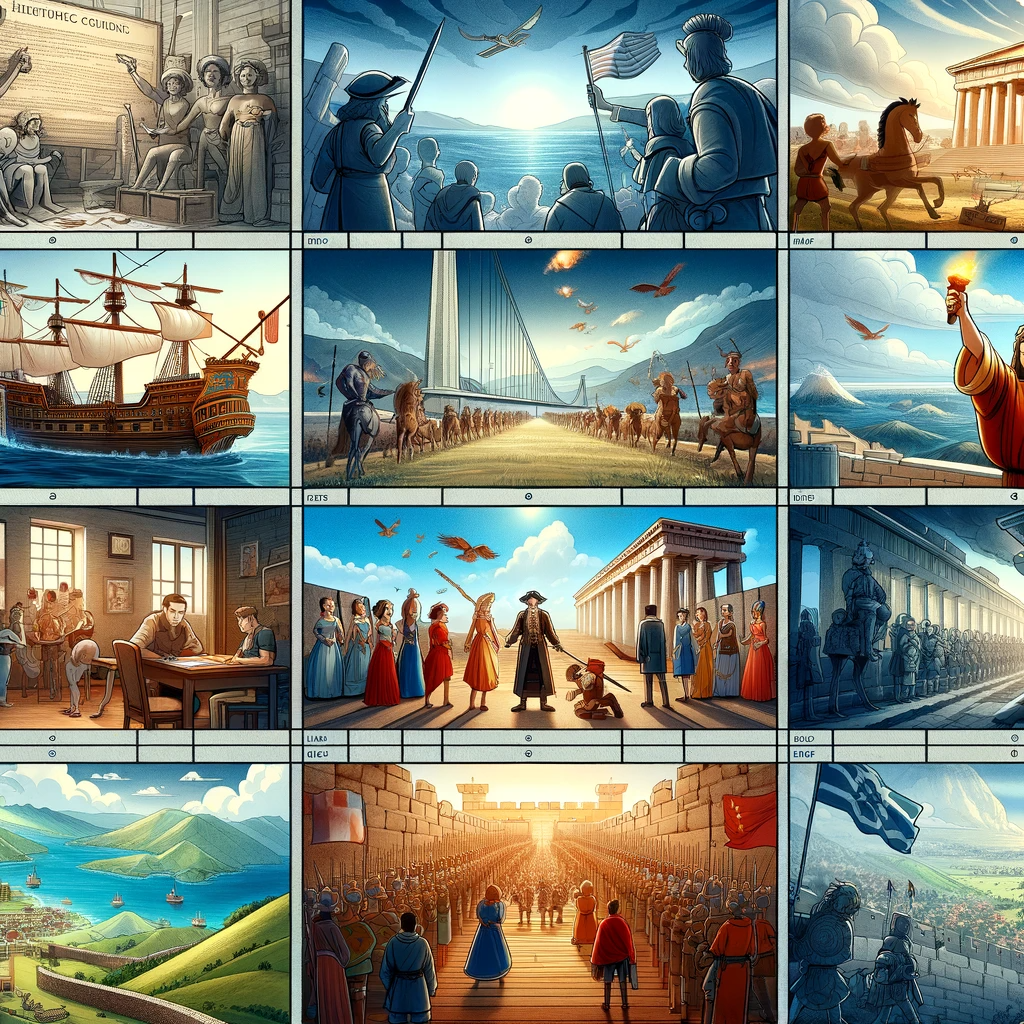 각 시대는 독특한 시각적 스타일을 가집니다. 고대 그리스는 밝고 대리석으로 가득할 수 있으며, 산업 혁명은 어둡고 기계적인 시각적 요소로 묘사될 수 있습니다.