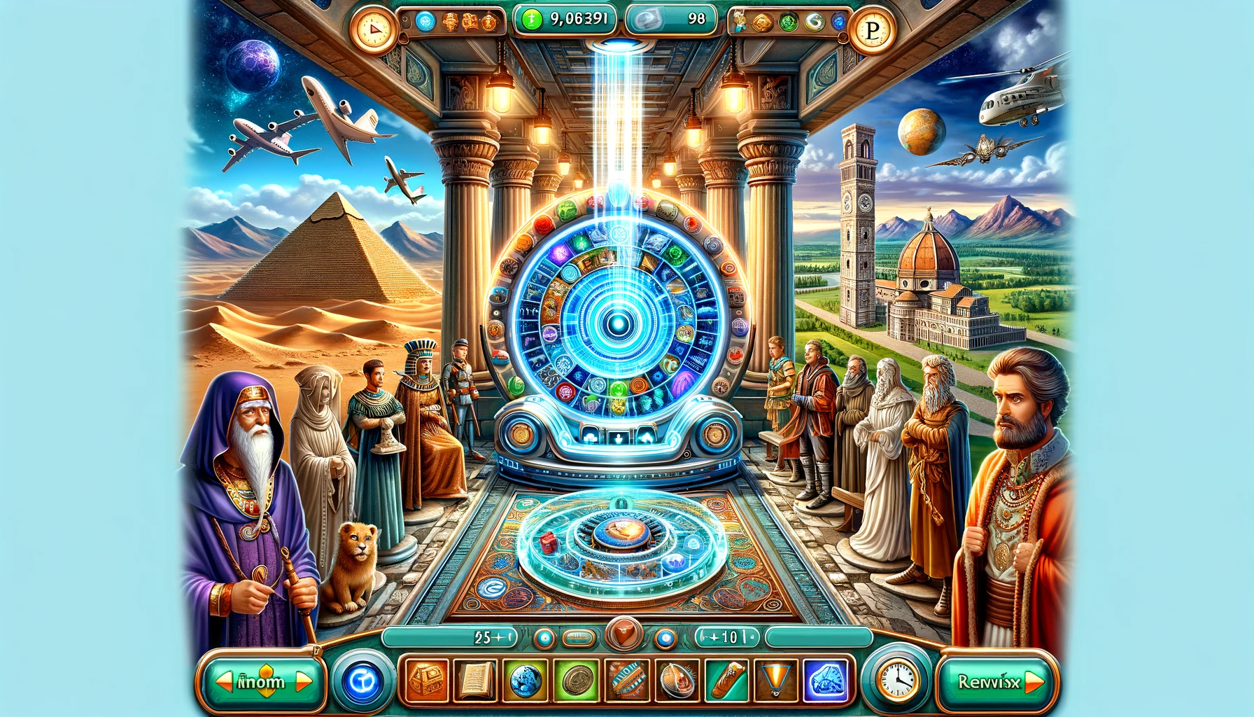 시간 여행 메커니즘: 플레이어는 가상의 시간 기계에서 시작합니다. 그들은 방문할 다양한 시대나 역사적 사건을 선택합니다. 각 선택은 새로운 모험으로 이어집니다.