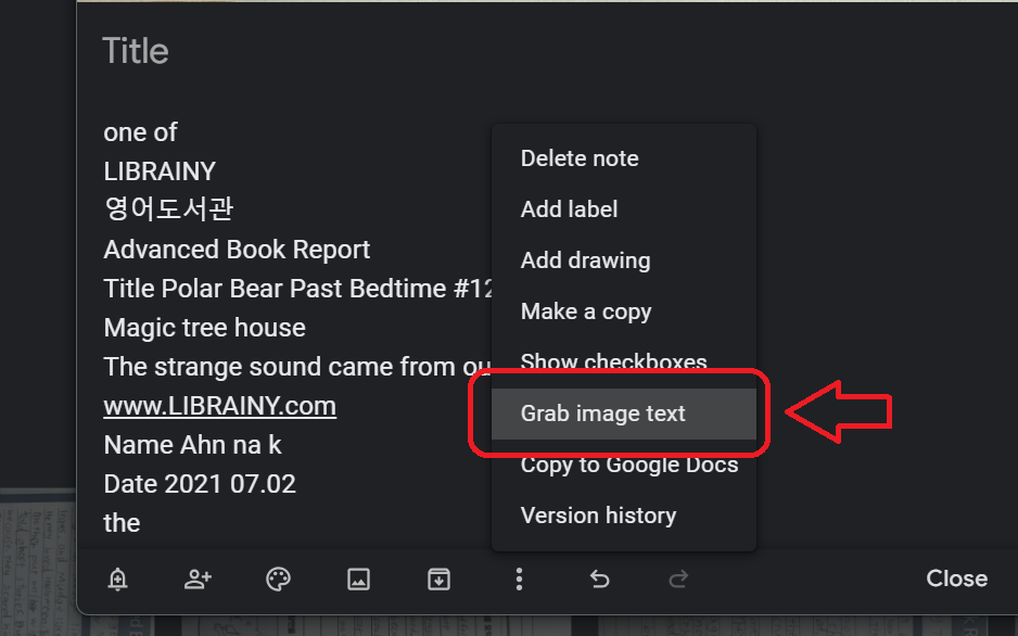 "Grab image text"를 클릭하면 이미지의 아래쪽으로 텍스트가 추출됩니다.