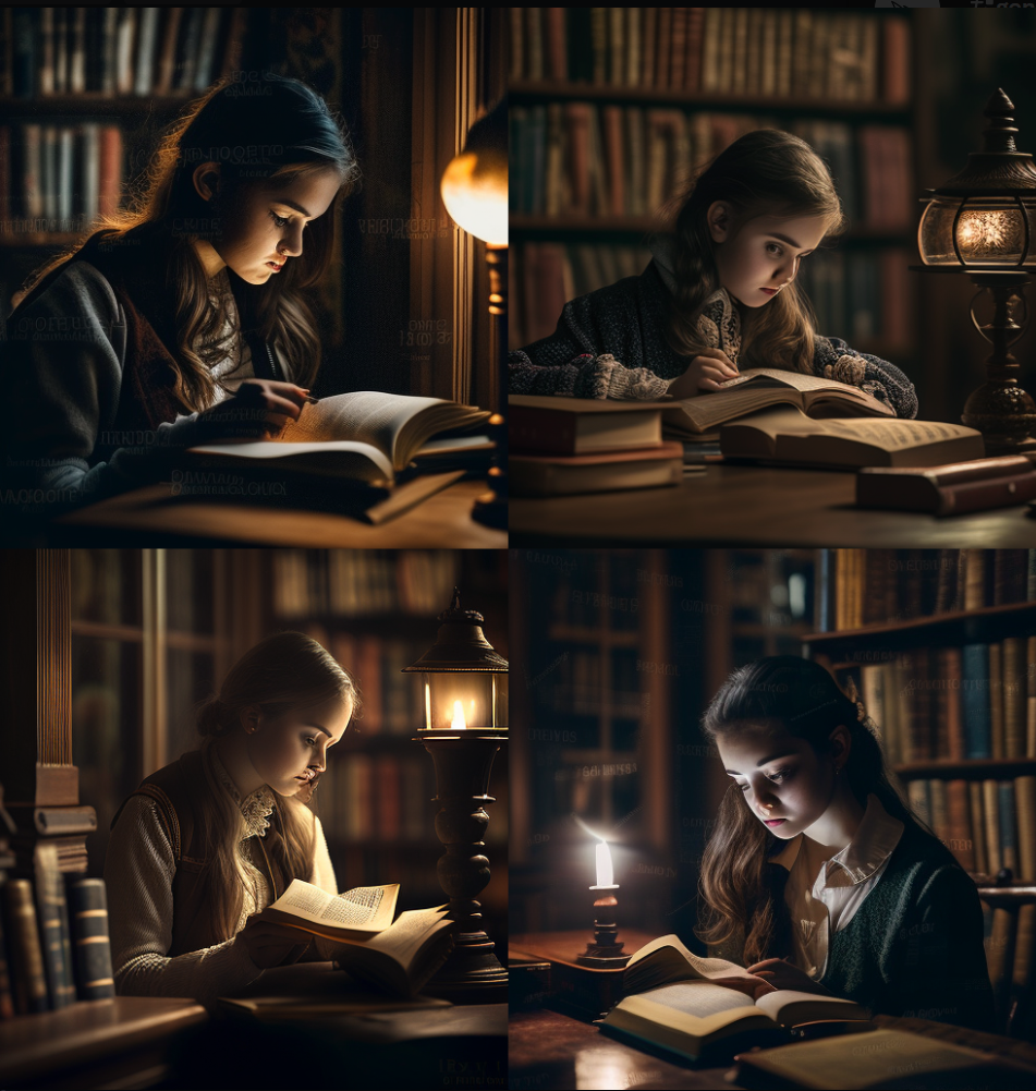 미드저니, 프롬프트: a beautiful girl reading a book in a library, elegant, studious, intelligent, serene, captivating, night, dimly lit, tranquil, shelves, books, wooden table, leather chair, antique, cozy, warm, quiet, inviting, parchment, paper, ink, hardcover, Glass, soft light, Adobe, depth-of-field, high-resolution, 3D-rendering, Canon, EOS, DSLR, wide-angle lens --stylize 738 --q 2 -