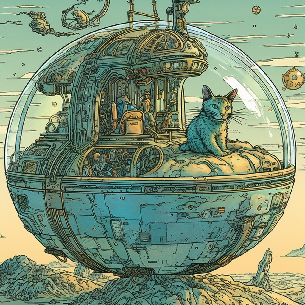이 매혹적인 작품의 중심에는 수정 구슬을 연상시키는 우주선 안에 자리 잡은 천상의 고양이가 있습니다.