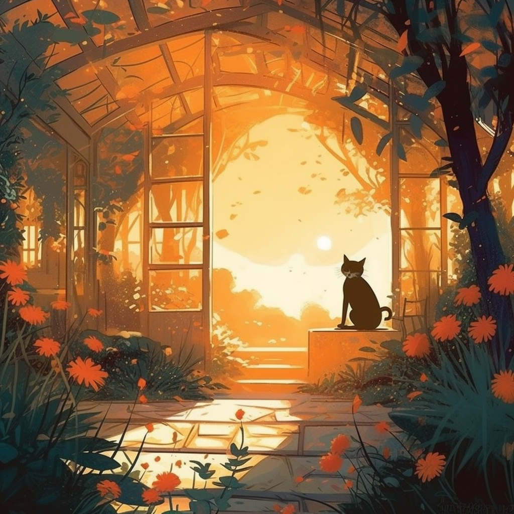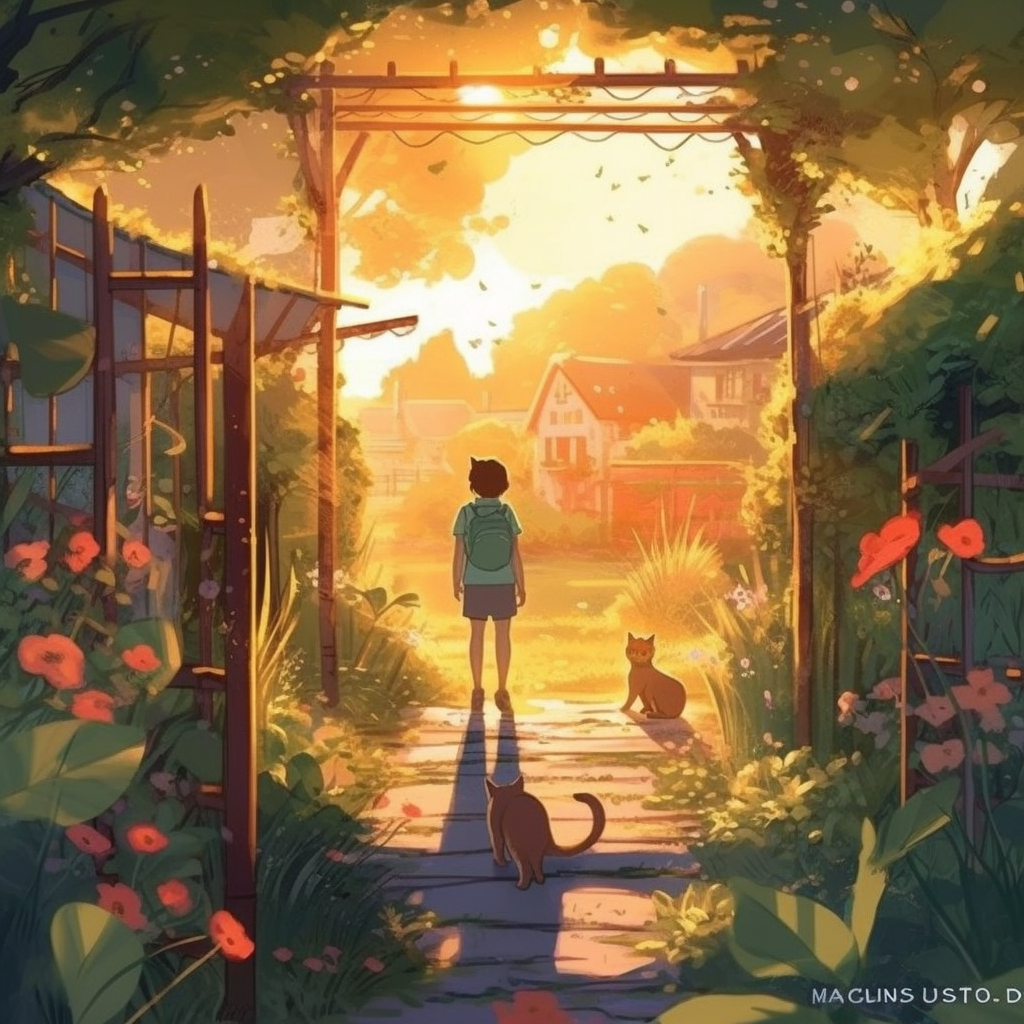 /imagine prompt: Create a heartwarming mid-journey scene featuring an adorable and fluffy cat exploring a magical, whimsical garden filled with blossoming flowers, playful butterflies, and enchanting fairytale elements, all bathed in the soft golden glow of a gentle sunset, masterfully created in a digital illustration. Channeling the whimsical style of Pascal Campion, the scene portrays the cat as it curiously watches a tiny gnome tending to the flowers. The color temperature is warm, with the soft sunset light casting an enchanting glow over the scene, creating a magical and dreamy atmosphere. The cat's eyes are wide with wonder, as it observes the gnome's work. The lighting is soft and diffused, enhancing the overall sense of warmth and wonder. --v 5 --stylize 1000