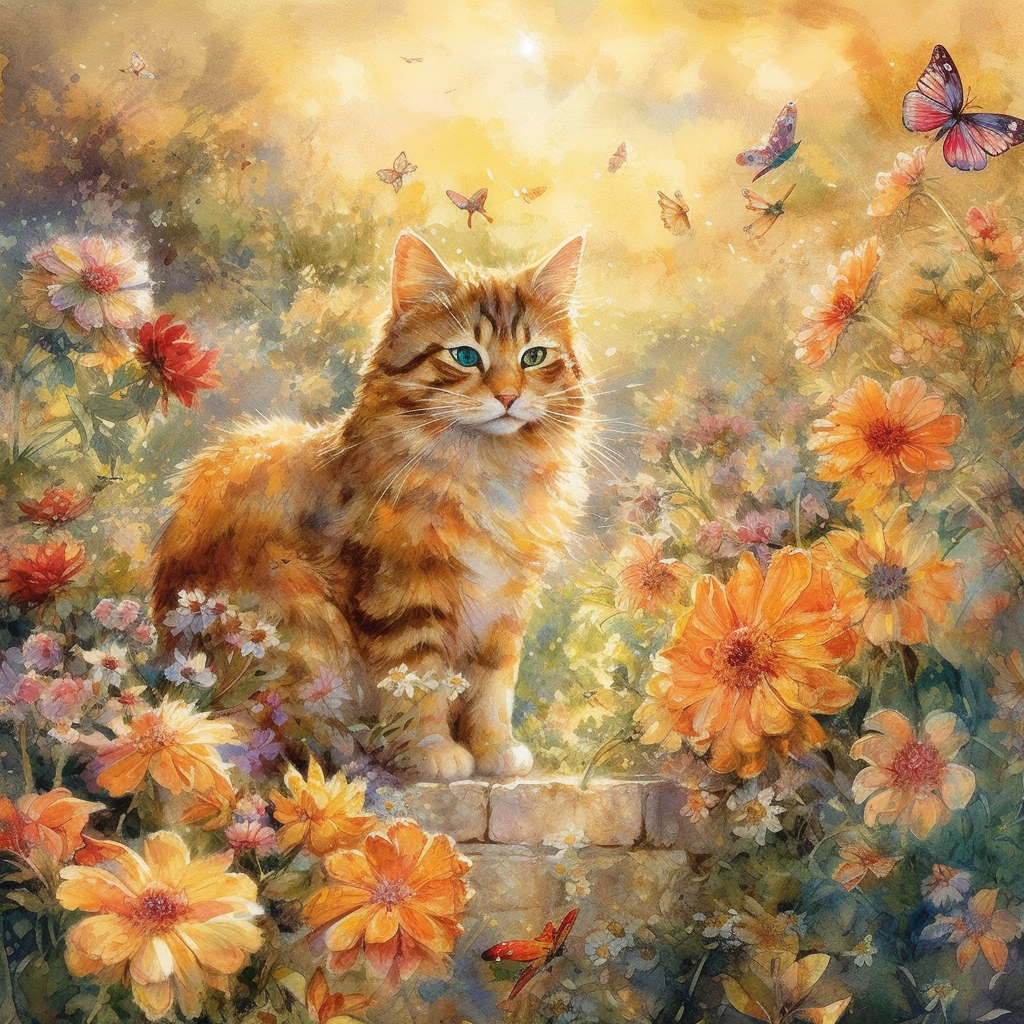 /imagine prompt: Create a heartwarming mid-journey scene featuring an adorable and fluffy cat exploring a magical, whimsical garden filled with blossoming flowers, playful butterflies, and enchanting fairytale elements, all bathed in the soft golden glow of a gentle sunset, portrayed in a mesmerizing watercolor painting. Inspired by the delicate touch of Mary Whyte, the scene depicts the cat gently sniffing a large, colorful flower. The color temperature is warm, with a gentle sunlight illuminating the scene, creating a dreamy and magical atmosphere. --v 5 --stylize 1000