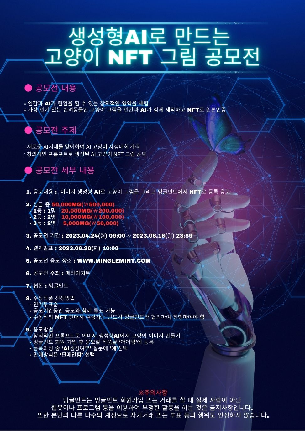 - 수상작의 NFT 판매시 수상자는 반드시 밍글민트와 협의하여 진행하여야 함