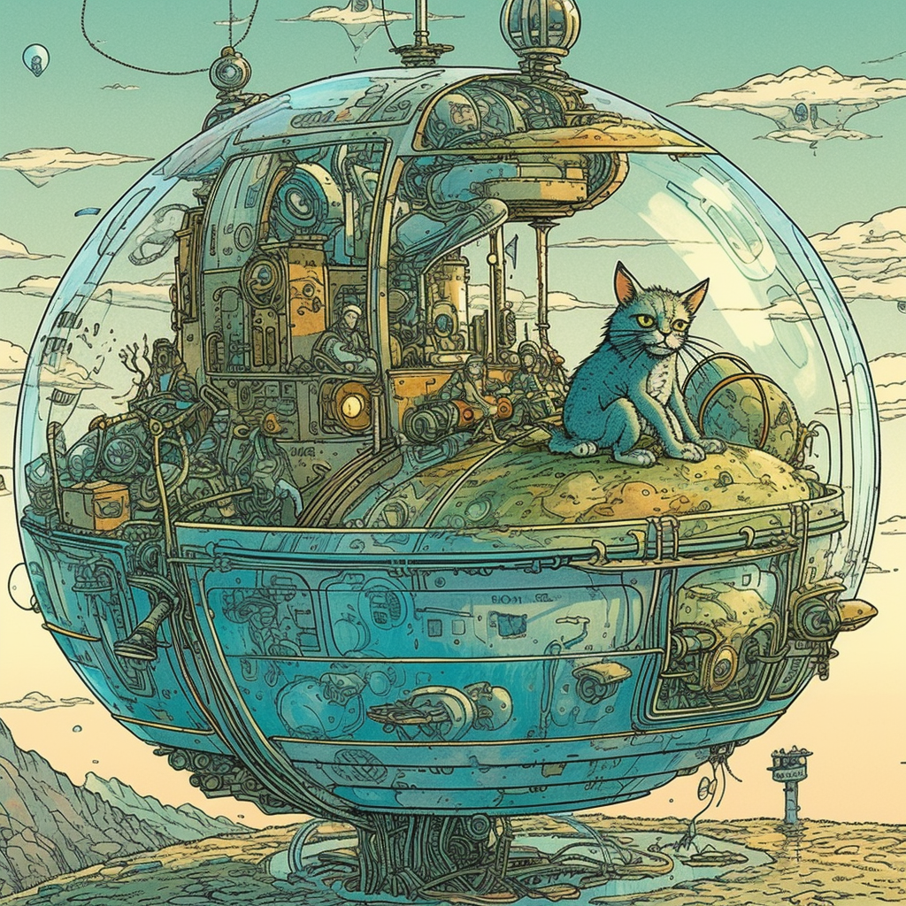 이 매혹적인 작품은 고양이의 지혜와 미래의 비전이 충돌하는 다른 세계의 영역으로 여러분을 안내하면서 AI 기술의 목적지에 대한 심오한 질문을 제기합니다.