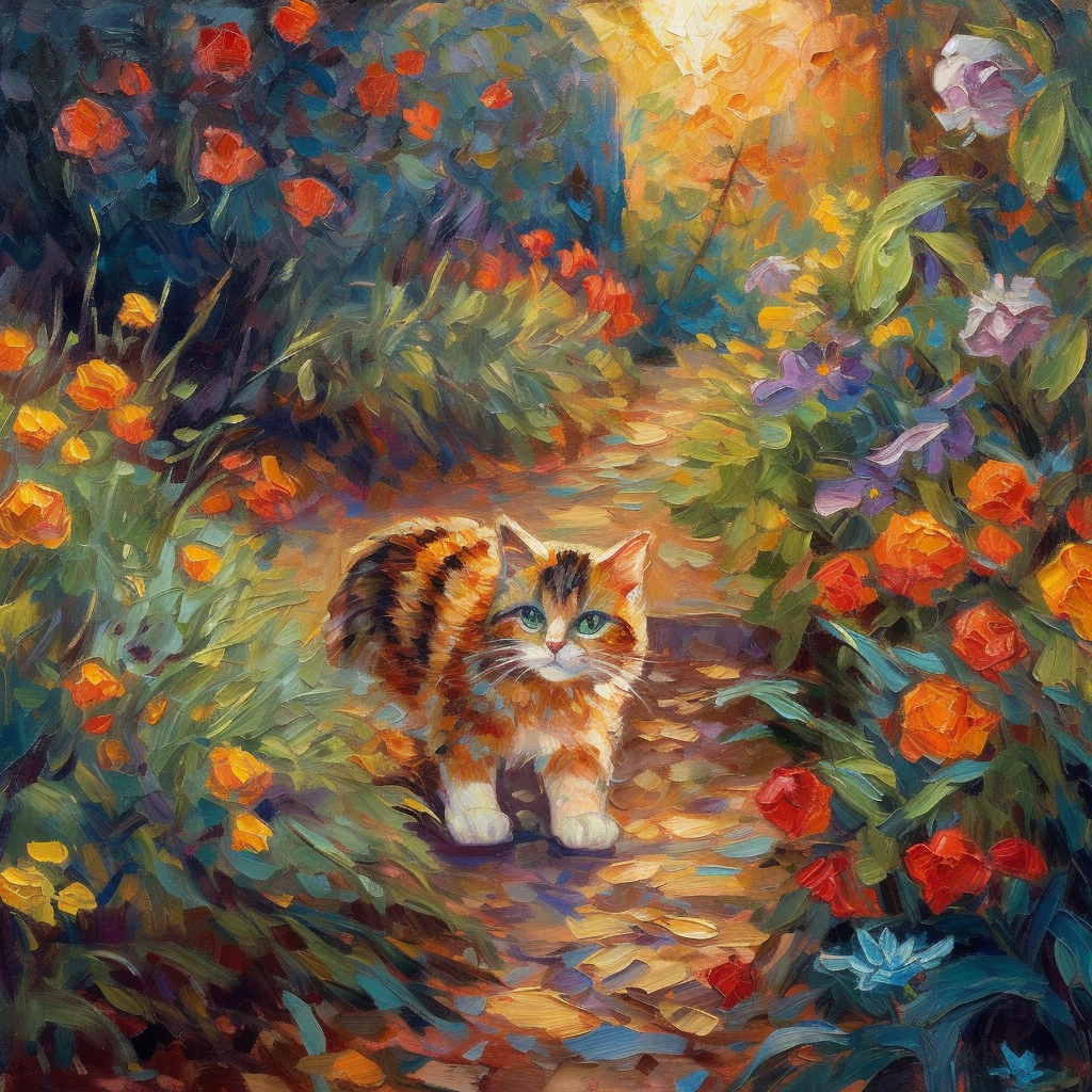 /imagine prompt: Create a heartwarming mid-journey scene featuring an adorable and fluffy cat exploring a magical, whimsical garden filled with blossoming flowers, playful butterflies, and enchanting fairytale elements, all bathed in the soft golden glow of a gentle sunset, brought to life in a vibrant oil painting. Inspired by the expressive brushstrokes of Vincent van Gogh, the scene captures the cat playfully chasing after a group of butterflies. The color temperature is warm and inviting, with the sunset casting a golden hue over the garden, creating a captivating atmosphere. --v 5 --stylize 1000