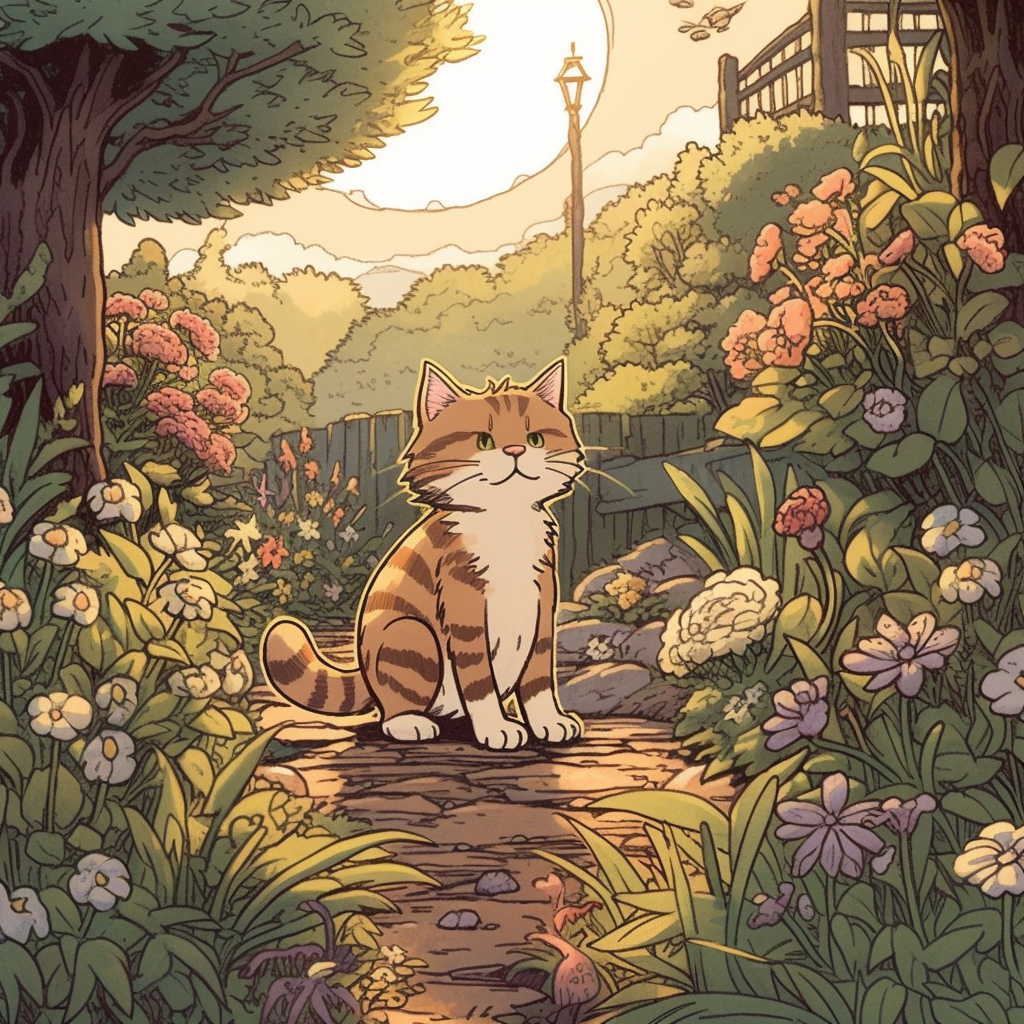 /imagine prompt: Create a heartwarming mid-journey scene featuring an adorable and fluffy cat exploring a magical, whimsical garden filled with blossoming flowers, playful butterflies, and enchanting fairytale elements, all bathed in the soft golden glow of a gentle sunset, rendered in a charming comic-style illustration. Drawing inspiration from the works of Bill Watterson, the scene shows the cat playfully batting at a floating fairy, surrounded by colorful flowers and butterflies. The color temperature is warm, with the soft light of the sunset creating a cozy and cheerful atmosphere. --v 5 --stylize 1000