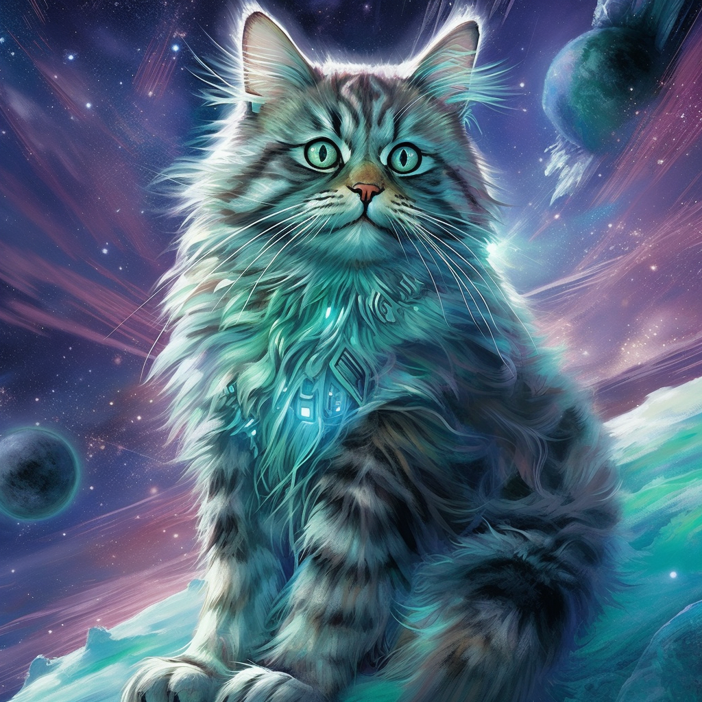 /imagine prompt: Bathed in the ethereal, prismatic hues of cosmic dust, a brave cat stands as the unlikely sentinel of Earth, her luminous green eyes gleaming with untamed resolution against the encroaching armada of alien invaders. Every follicle in her fur is rendered in ultra-high 16K resolution, each strand imbued with an unreal level of detail that pushes the boundaries of photorealism. The depth of field offers a hyper-detailed focus on the feline guardian, her coat shimmering under the volumetric lighting that spills from the vast, star-speckled abyss above,
