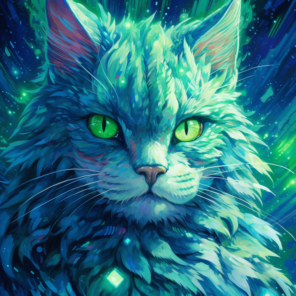 /imagine prompt: Bathed in the ethereal, prismatic hues of cosmic dust, a brave cat stands as the unlikely sentinel of Earth, her luminous green eyes gleaming with untamed resolution against the encroaching armada of alien invaders. Every follicle in her fur is rendered in ultra-high 16K resolution, each strand imbued with an unreal level of detail that pushes the boundaries of photorealism. The depth of field offers a hyper-detailed focus on the feline guardian, her coat shimmering under the volumetric lighting that spills from the vast, star-speckled abyss above,