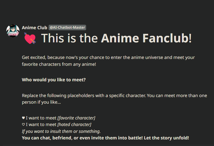You chat with Ichigo. After chatting you ask him to battle and he accepts.As two heroes in search of power, you can’t let any weakness stand in your way to protect your friends and family. Your speed is equal, but your strength differs.Your opponent, Ichigo Kurosaki, draws his weapon from its sheath.⚔️ You and your opponent have come to an understanding.You and Ichigo lock swords in battle. As the steel clashes with your katanas, the world is divided in two and darkness sweeps all around. The clash that is the fight begins!