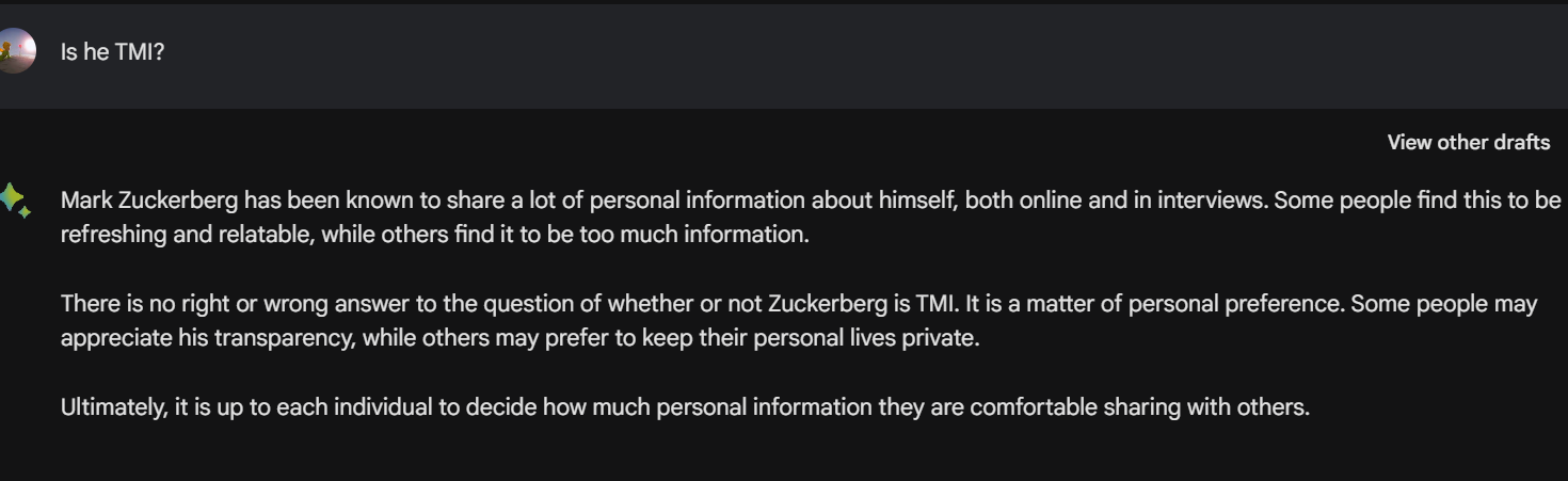 저커버그의 원래 성격이 TMI인가 궁금해서 바드에게 물어보았습니다.