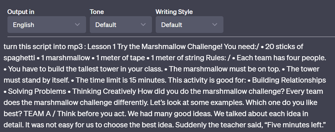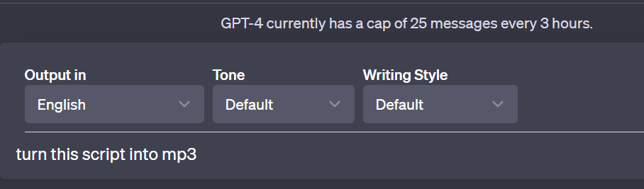 간단하게 프롬프트를 넣었습니다. "Turn this script into mp3"