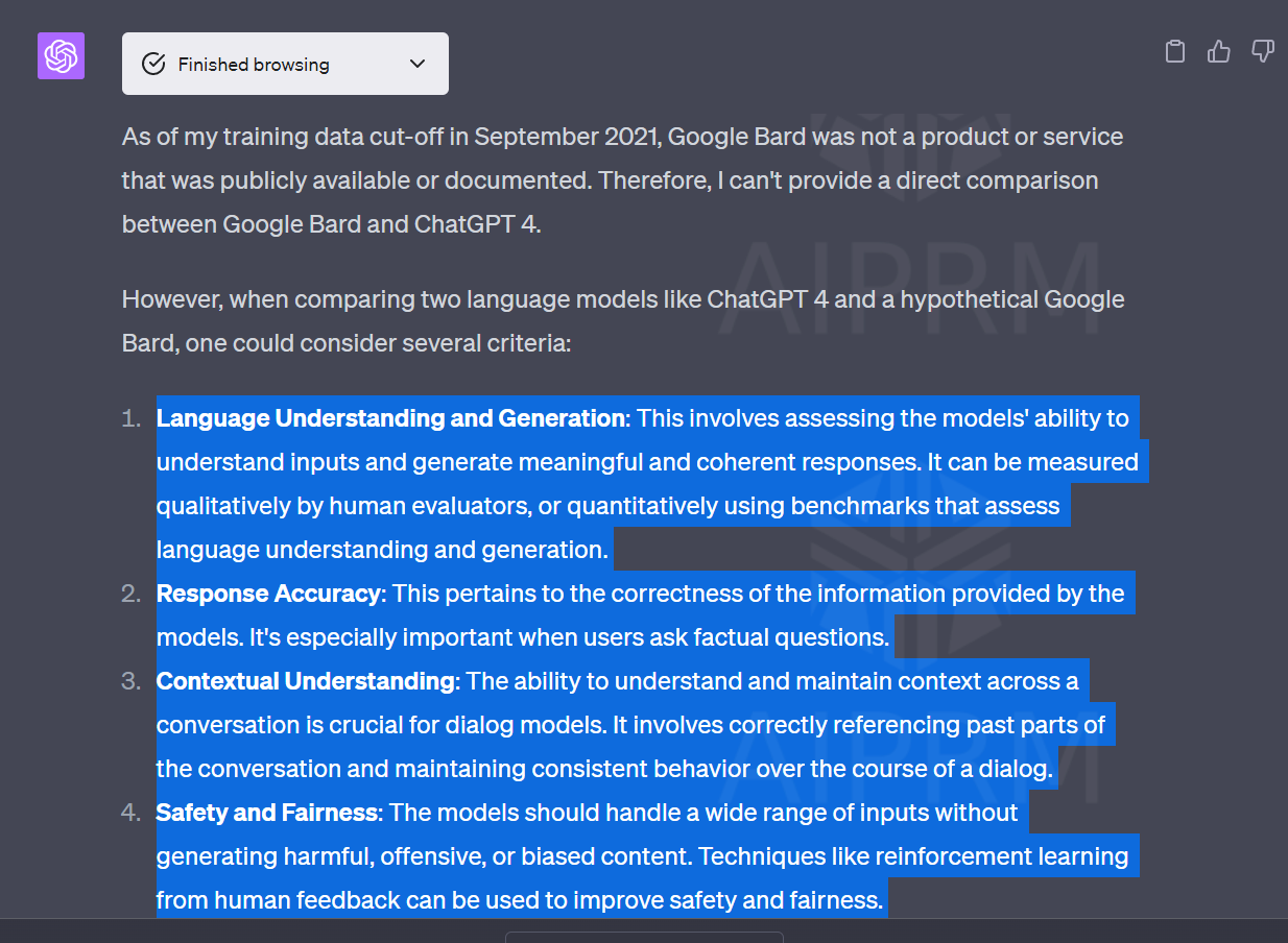 2021년까지의 데이터로 학습되었기 때문에 지피티에게 Google Bard는 존재하지 않는 가상의 대상이라는 메시지가 나옵니다. ChatGPT4의 장점은 여기에서 발휘됩니다. 가상이지만 Google Bard가 존재한다는 가정하에 기준을 제시합니다.