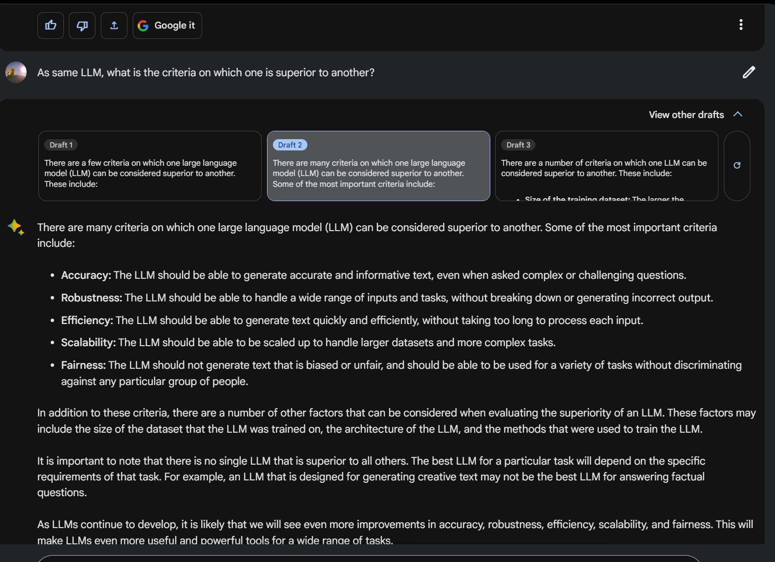 먼저 Bard에게 같은 LLM을 비교할 때, 기준(criteria)가 무엇이어야 하냐고 물어보았습니다.