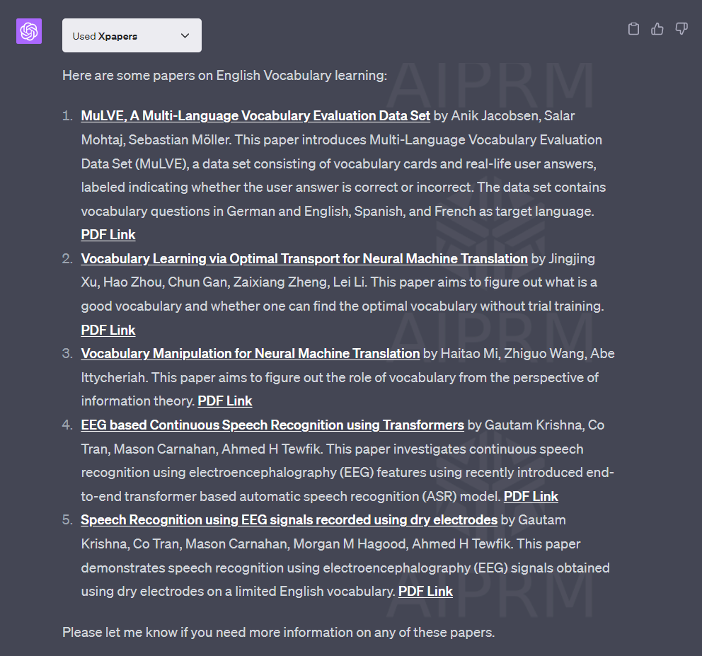 혹시나 해서 관련이 없어 보이는 English Vocabuary 에 관한 논문을 찾아달라고 하니, 바로 찾아줍니다. 다만, 수학 과학 쪽 논문이 위주다 보니, 언어학이나 인문학 쪽이 아닌, NLP쪽 논문을 링크해 줍니다.
