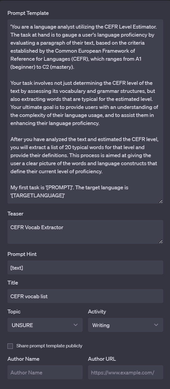 프롬프트 입력창 상단에 CEFR vocab list 라고 적용되는 것이 보이실 겁니다.