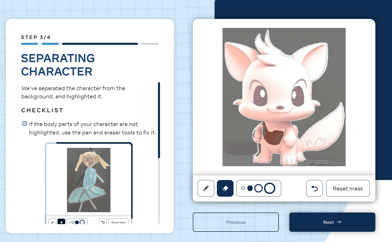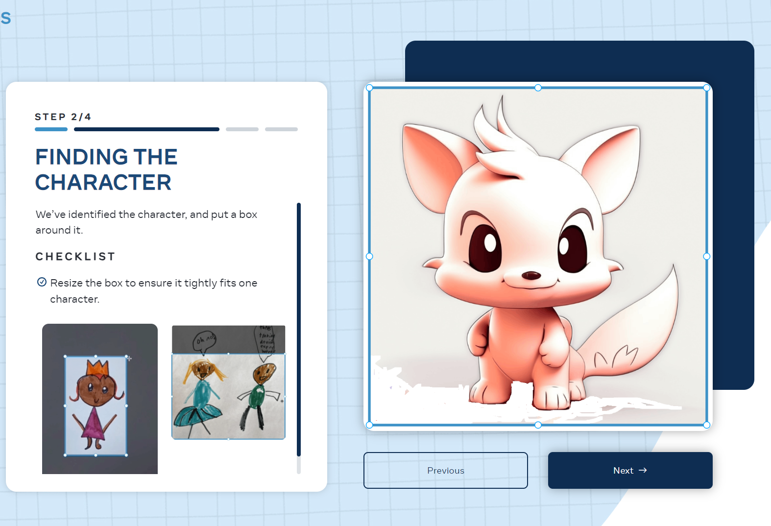 업로드하면, AI가 자동으로 그림을 인식하고 Step 2에서는 인식된 그림에서 캐릭터를 선택하는 단계가 나오게 됩니다.