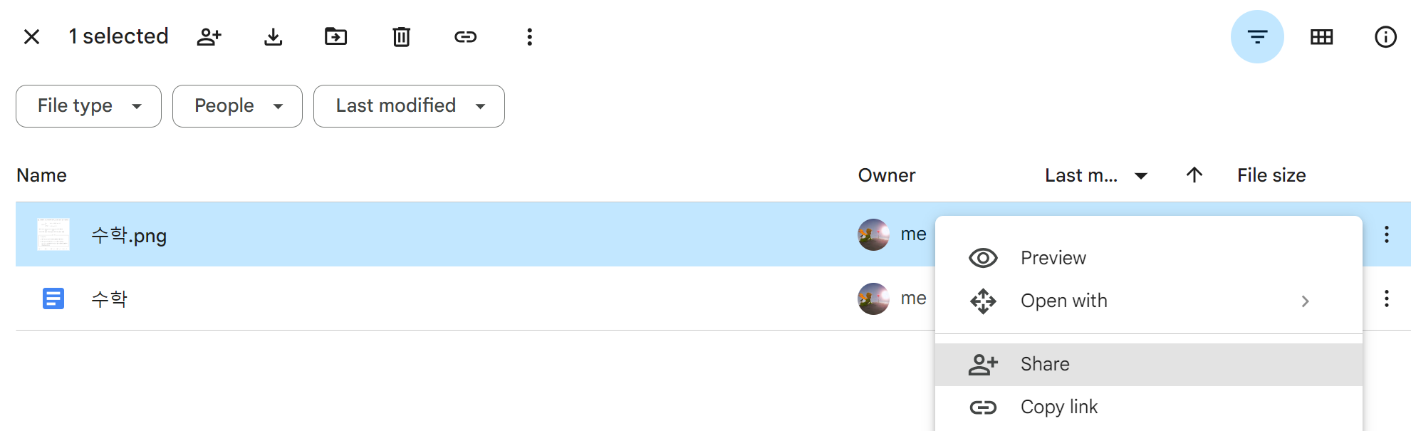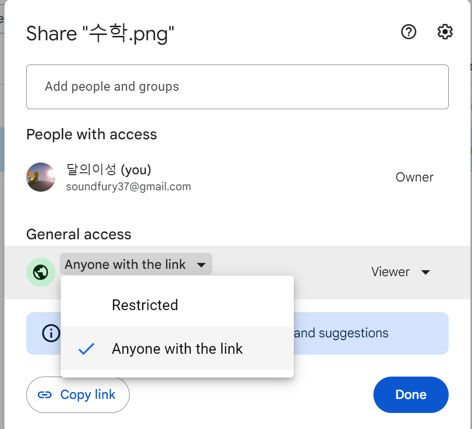 공유 (share) 에서 접근권한 설정(General access)로 들어가서 Restriced(제한된) 을 Anyone with the link (링크를 가진 누구나)로 변경합니다.