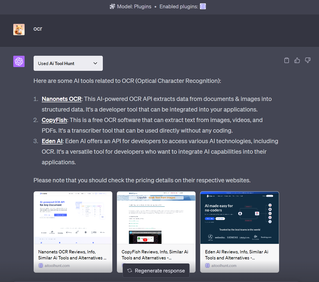 AI Tool Hunt 플러그인을 활성화하고 OCR 이라고 프롬프트를 넣었습니다.