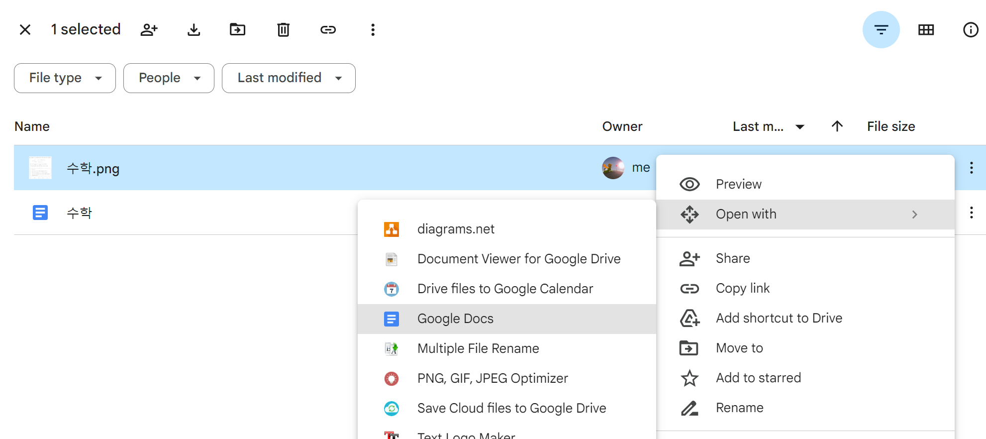 구글 드라이브 폴더 속의 파일을 Google Docs로 열어보는 방식입니다.