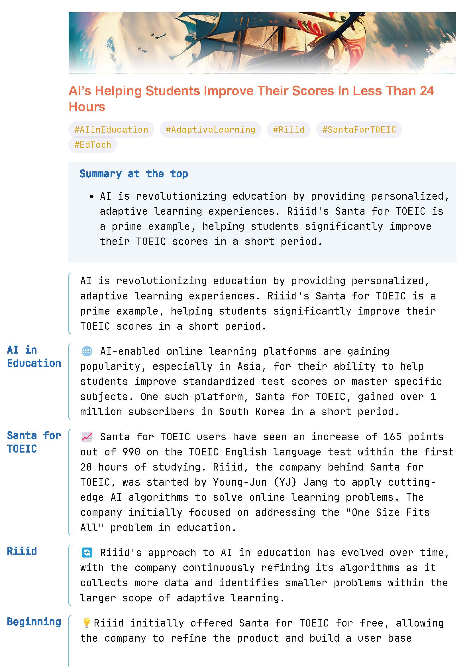 📈 Santa for TOEIC users have seen an increase of 165 points out of 990 on the TOEIC English language test within the first 20 hours of studying. Riiid, the company behind Santa for TOEIC, was started by Young-Jun (YJ) Jang to apply cutting-edge AI algorithms to solve online learning problems. The company initially focused on addressing the "One Size Fits All" problem in education.